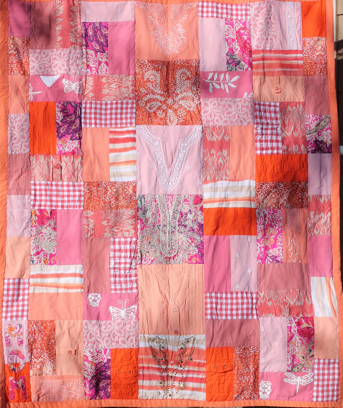 Received the blanket today! It is absolutely beautiful! My daughter, myself and my husband are so grateful and thankful for the love and care taken to sew such a masterpiece. This throw will be cherished forever. Thank you again for all your hard work.